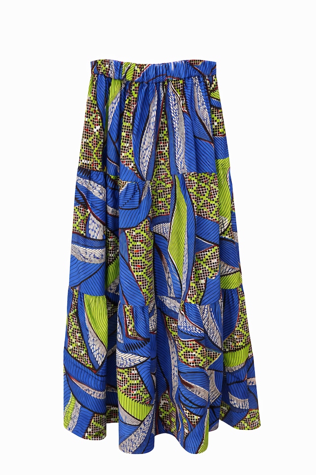 コートジボワールUNIWAX社のWak Block生地を使った3段ティアードスカートです。 ワックスプリントとは... 生地にロウ(ワックス)で模様をつけ、ベースとなる色に染色した後洗い流すと、白い模様ができます。その後、上から色を複数回重ねていくプリント方法です。ロウのひび割れが唯一無二の美しい風合いを表現します。 【サイズ】 丈: 85cm ウエスト: 平置き60cm(ゴムで80cm程度まで対応) ポケット: 両サイド有り 生地: 綿100%(コートジボワールUNIWAX製・Wax Blockプリント) 制作: 日本 【注意事項】 ✔︎1つ1つ柄の出方には多少の差があります。 ✔︎ワックスプリントの特性上、プリントが少し擦れていることがありますが、風合いとしてお楽しみください。 ✔︎摩擦、水濡れ、汗により色移りすることがありますので十分ご注意ください。 【洗濯方法】 洗濯機での洗濯が可能ですが、色の薄いものと一緒に洗うことは避け、洗い終わったら放置せず、速やかにハンガーに干していただくようお願いいたします。 【商品購入による寄付の仕組み】 売上の10%は、セネガルの女性と子どもの保護を目的に活動する一般社団法人ゲヌへの寄付とさせていただぎす。 【配送方法】 他の商品と同梱の場合は、高い方の送料が適用になります。 ※紙による納品書や領収書の発行は基本的に行っておりません。必要な方は事前におしらせください。