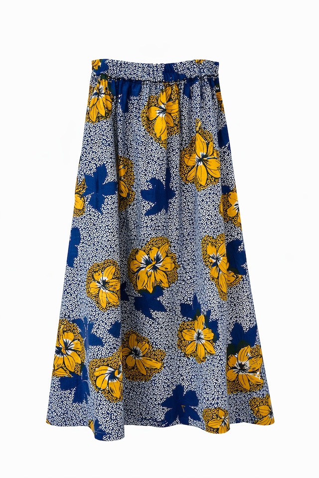 コートジボワールUNIWAX社のWak Block生地を使ったフレアスカートです。 ワックスプリントとは... 生地にロウ(ワックス)で模様をつけ、ベースとなる色に染色した後洗い流すと、白い模様ができます。その後、上から色を複数回重ねていくプリント方法です。ロウのひび割れが唯一無二の美しい風合いを表現します。 【サイズ】 丈: 85cm 裾周り: 200cm ウエスト: 平置き60cm(ゴムで80cm程度まで対応) ポケット: 両サイド有り 生地: 綿100%(コートジボワールUNIWAX製・Wax Blockプリント) 制作: 日本 【注意事項】 ✔︎1つ1つ柄の出方には多少の差があります。 ✔︎ワックスプリントの特性上、プリントが少し擦れていることがありますが、風合いとしてお楽しみください。 ✔︎摩擦、水濡れ、汗により色移りすることがありますので十分ご注意ください。 【洗濯方法】 洗濯機での洗濯が可能ですが、色の薄いものと一緒に洗うことは避け、洗い終わったら放置せず、速やかにハンガーに干していただくようお願いいたします。 【商品購入による寄付の仕組み】 売上の10%は、セネガルの女性と子どもの保護を目的に活動する一般社団法人ゲヌへの寄付とさせていただぎす。 【配送方法】 他の商品と同梱の場合は、高い方の送料が適用になります。 ※紙による納品書や領収書の発行は基本的に行っておりません。必要な方は事前におしらせください。